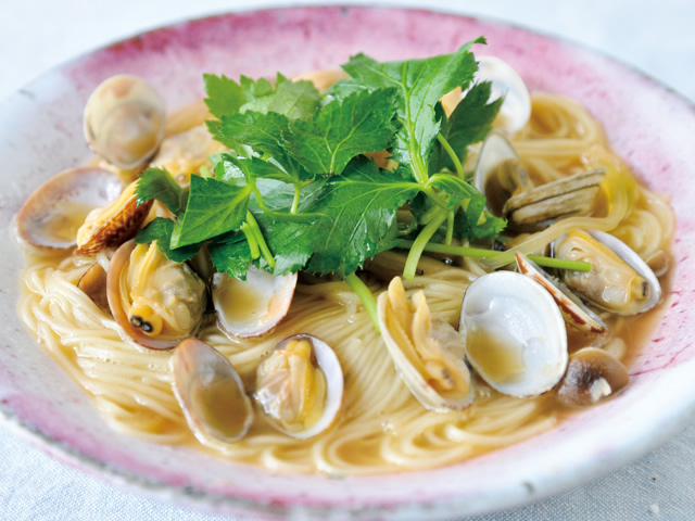 そうめんを茹でて(固めに茹でる)、具材が入った鍋に取り出したあさりと共にそうめんを加え、皿に盛りつけて完成です。