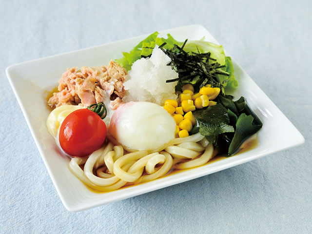 うどんに【2】で用意したものをのせ、濃いめに水でうすめためんつゆをかけます。