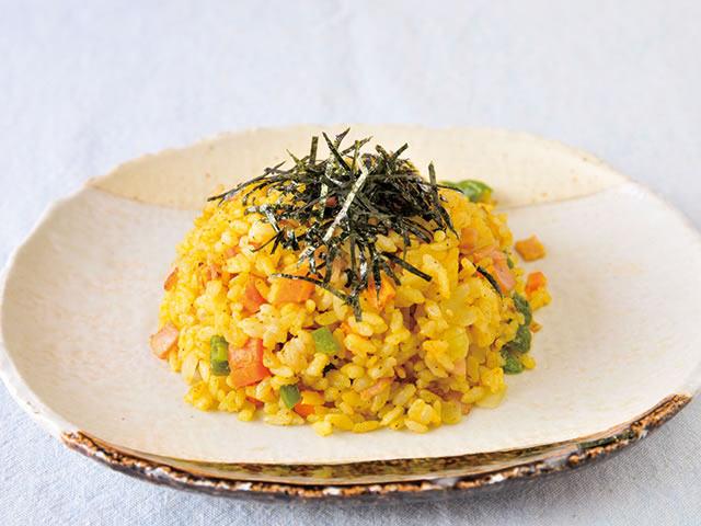 最後に水大さじ4杯を入れるとふわっとします。皿に盛りつけきざみのりを載せて完成です。