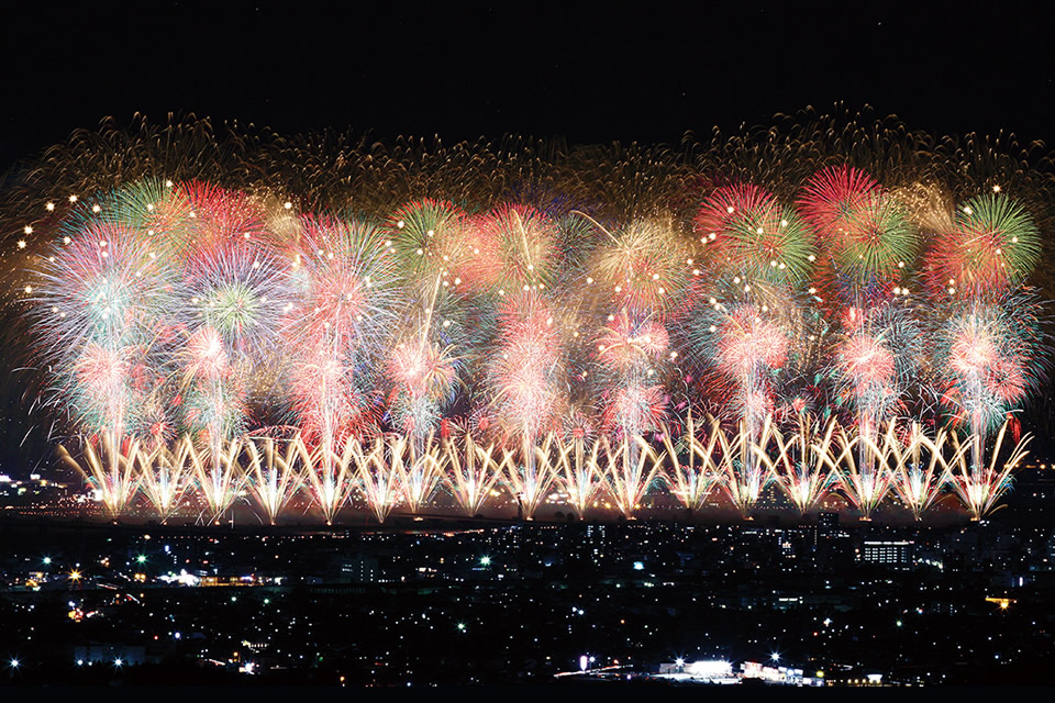 正三尺玉三連発・ミュージックスターマインなど約2万発の花火が夜空を彩るのは、日本三大花火大会の一つ「長岡まつり大花火大会」。息を飲むほど美しい大輪の花火を間近で是非!