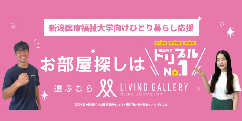新潟医療福祉大学様と提携しており、学生様向けアパートも多数ご紹介できます。優良賃貸物件をお探しなら、お気軽にリビングギャラリー新潟北店へお越しください。